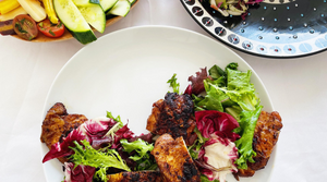 On a serving platter. Place salad greens then chicken. Coat chicken with remaining stock and dressing.