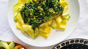 Place summer squash salad around the edges of the serving platter. Then place the salmon on the center of the platter. Coat salmon with a layer of pesto and broccolini and golden beet mix. Finish with squeezing charred lemon juice.